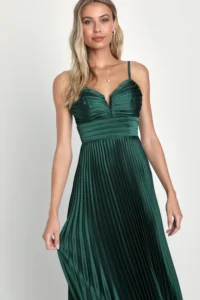 Garnesh your evening look with the Fabulous Perfection Emerald Green Satin Pleated Midi Dress, $82 at Lulus.com.