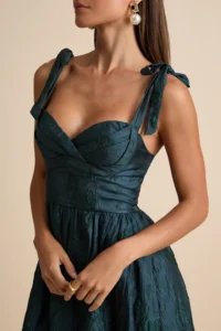Romance never fades — it just adapts with the season. This emerald midi, with its floral jacquard pattern and pleated satin finish, exudes timeless sophistication. The sweetheart neckline and flowing skirt bring movement and grace, while the rich emerald hue mirrors the depth of winter evergreens.