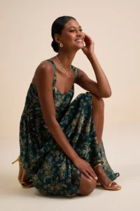 Winter dressing doesn’t have to be heavy, and this Francesca midi proves it. Its flowy A-line cut, side slit, and floral dark teal fabric strike the right balance between playful and polished. The tie-back adds youthfulness, while the pockets bring in a practical charm (yes, pockets!).
