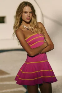 This one is pure sunshine bottled into a dress. With retro piping along the seams and a playful drop-waist cut, the Ravine Mini feels like it was made for a spontaneous picnic in the park. The tube bodice hugs softly at the top while the flared hemline keeps it flirty and free. In breezy 100% cotton, it’s the kind of dress that looks just as cute with strappy sandals as it does layered with an oversized denim jacket.
